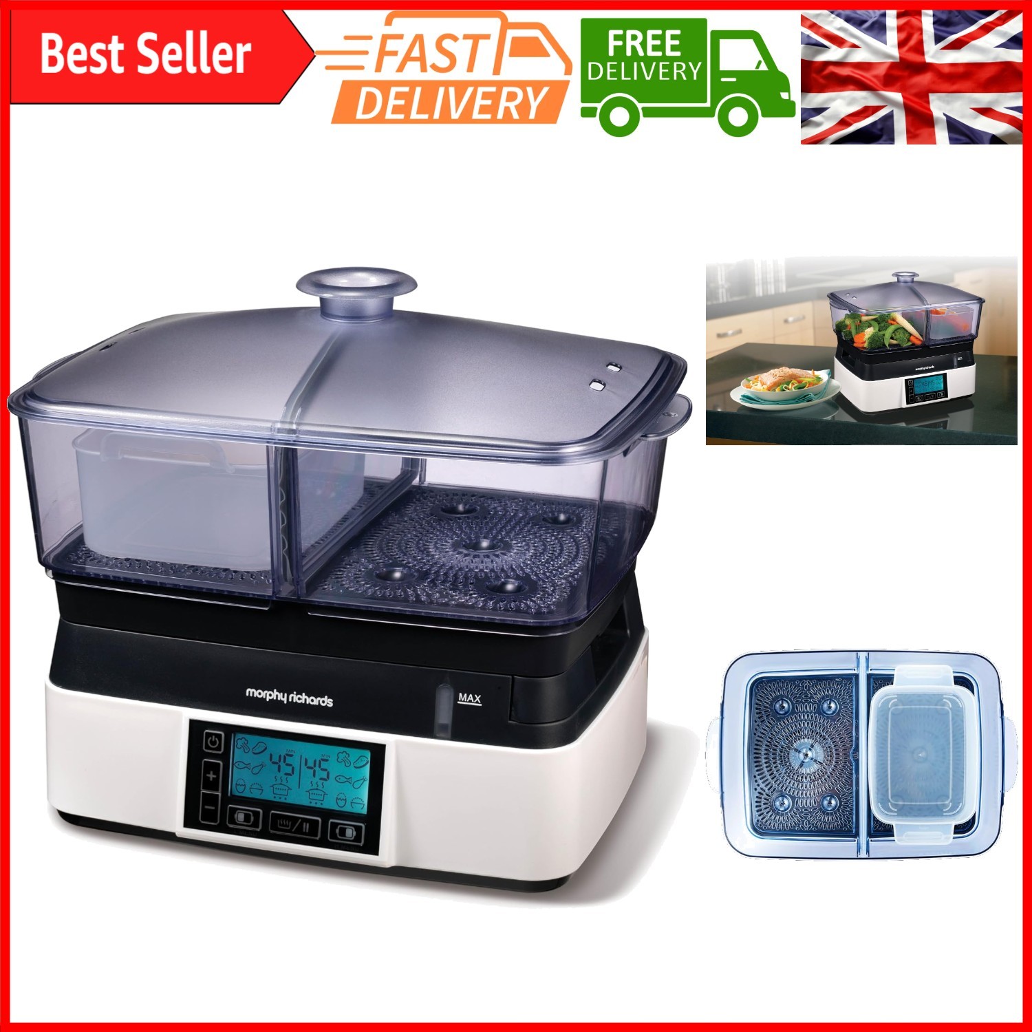 Morphy Richards 6L Intellisteam Compact Food Steamer, Synchronised Steaming, Digital Display, Memory System, White & Black, 48775