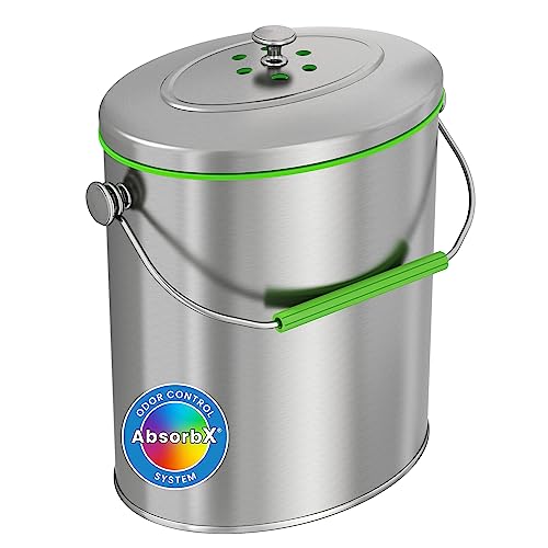 iTouchless Stainless Steel Compost Bin 1.6 Gallon Includes AbsorbX Odor Filter System, Pest-Proof, Titanium Rust-Free Space-efficient Slim Oval Shape 6 Liter Kitchen Countertop Trash Can