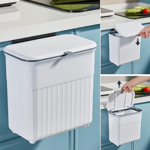 COCOYA Hanging Trash Can with Lid, 2.3 Gallon Kitchen Garbage Bin Food Waste Container Convenient Durable Over Cabinet Door RV Counter Camping Cupboard Under Sink Compost Bathroom Wall Mounted