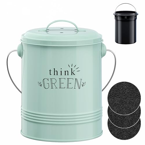 Barnyard Designs Decorative Compost Bin with Lid for Kitchen Countertop, Food Composter Container Can, Small Indoor Compost Trash Bucket, 1 Gallon (4.5L), Galvanized Steel, 18 x 24cm, Mint