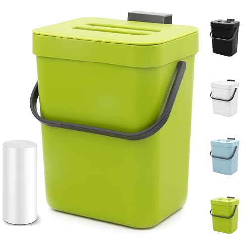 MONGTINGLU Compost Bin for Kitchen Countertop, 1.3 Gallons Hanging Small Trash Can with Lid, Kichen Under Sink Trash Can, Wall Mount Indoor Compost Bucket with Lid, 5L(Lime Green)