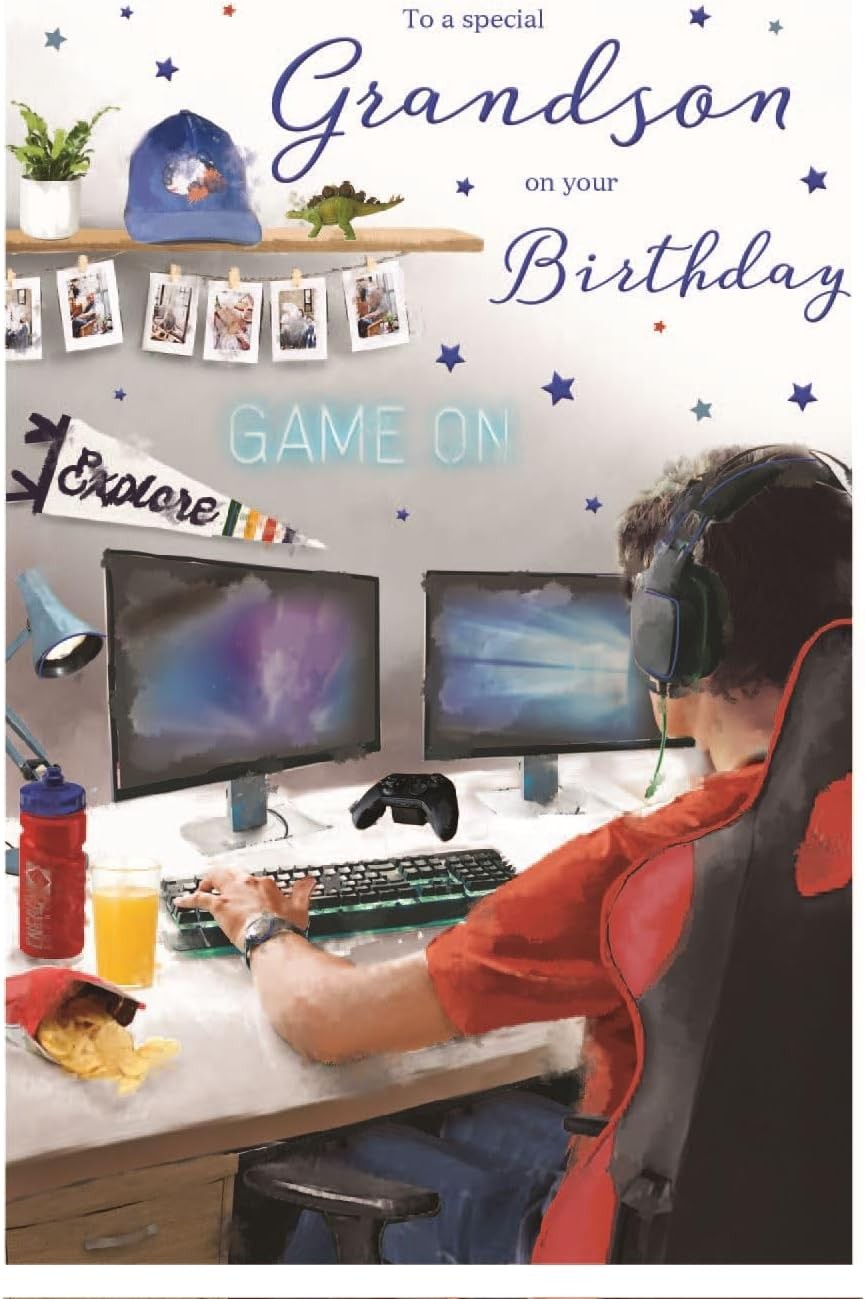 IC&G Special Grandson Birthday Card - Computer Gamer with Headphones and Snacks with a Foil Finish