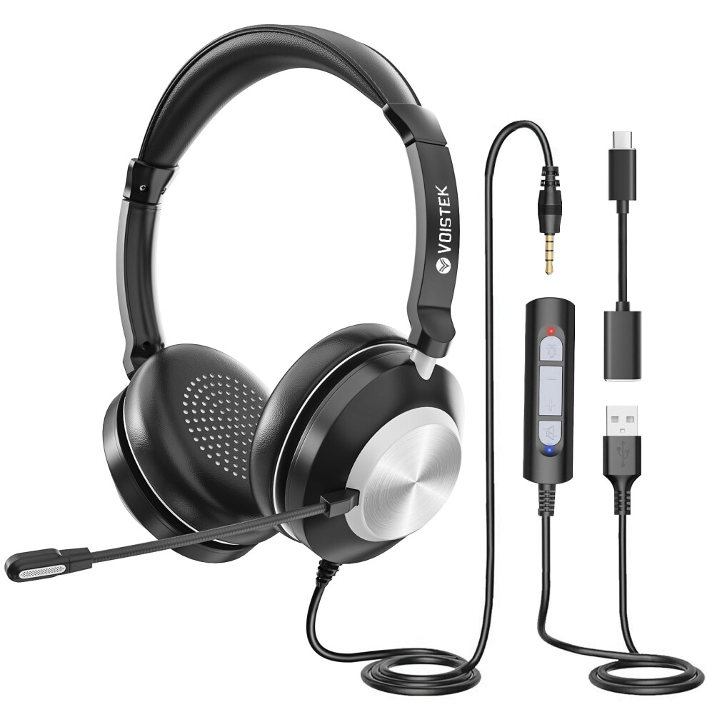 Voistek USB Headset with Microphone for Laptop,PC Headphones with USB/Type-C/3.5mm Jack,Computer Headset with Noise Cancelling Mic,In-Line Volume Control & Mute Button for Call Centres,Home,Office