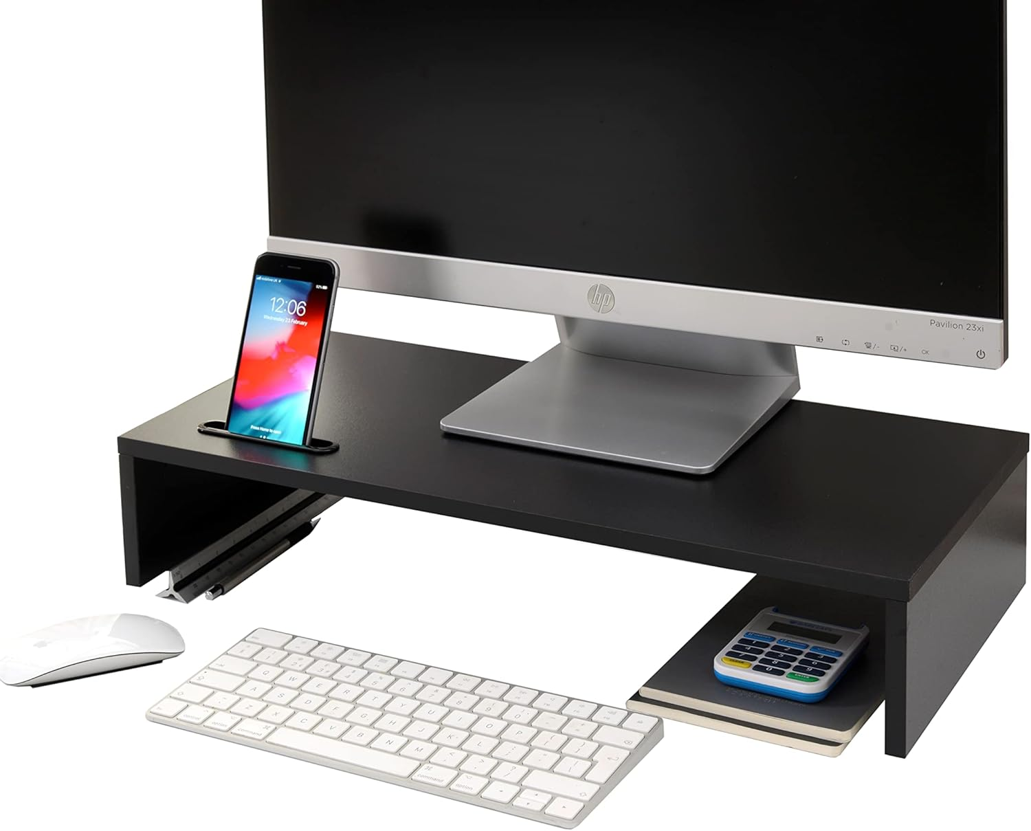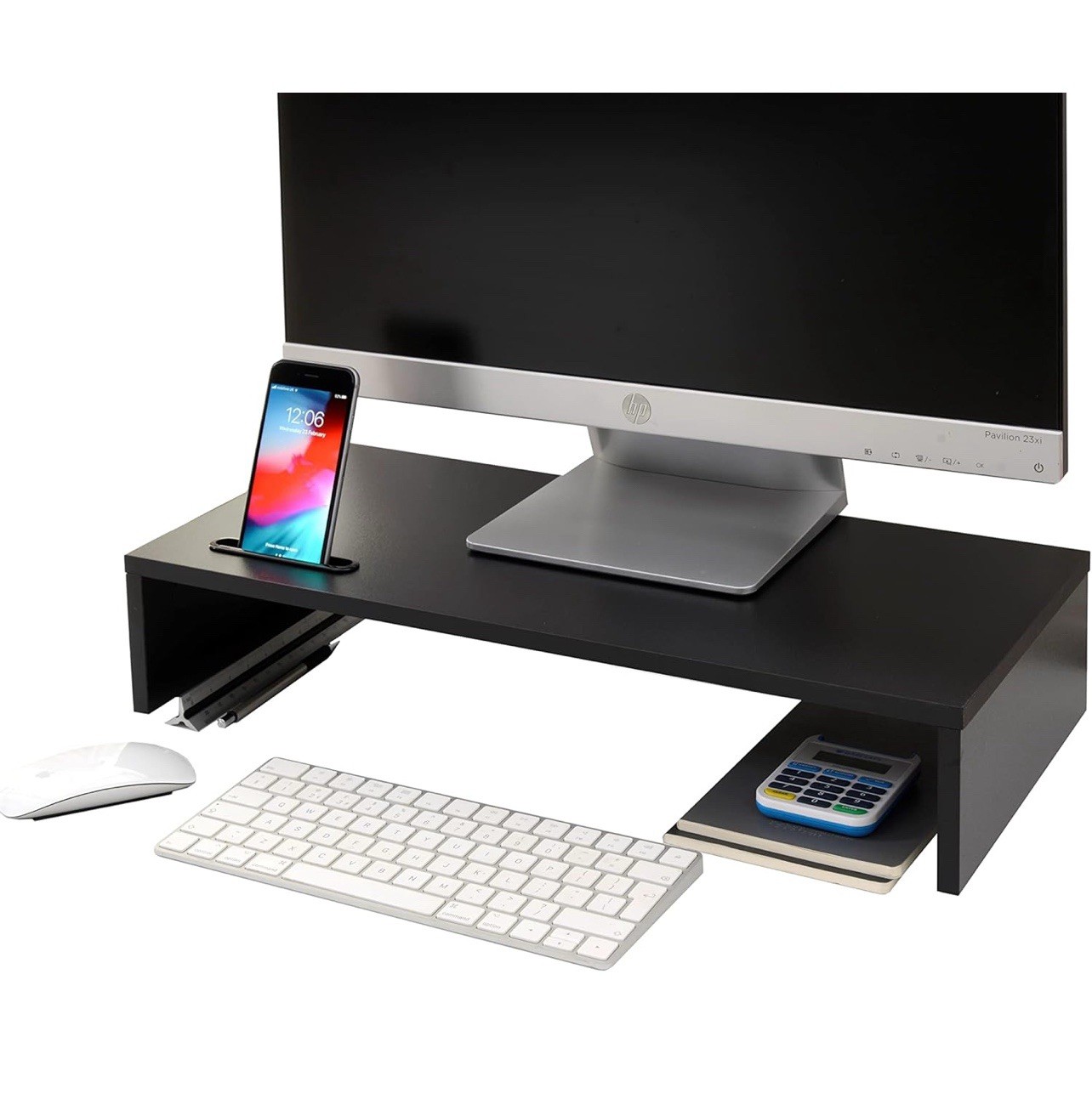 Ttap Black Wooden Monitor Two Shelf Stand Computer Laptop TV Screen Riser Desk Organiser 54cm L x 24.5cm D x 14.4cm H (with Smartphone holder)