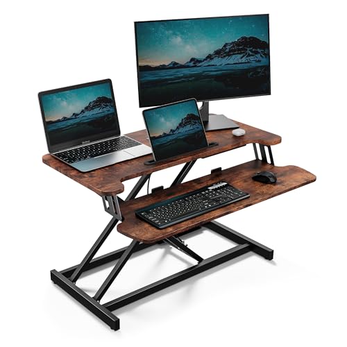 VonHaus Standing Desk Converter, Height Adjustable Computer Workstation with Keyboard Shelf, Dual Monitor Desk Riser w/Tablet Holder - 80x40cm (Dark Wood)