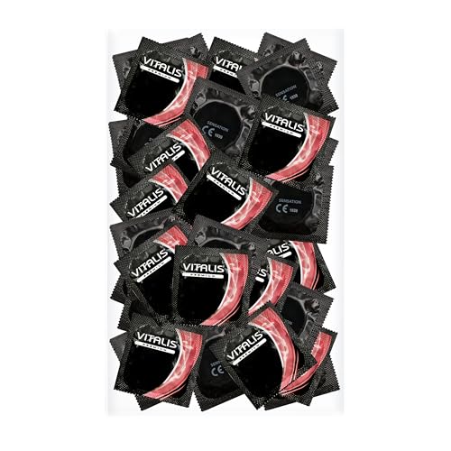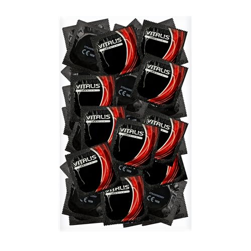 VITALIS 100 Condoms Pack with Strawberry Flavour I Nominal Width 53 mm I Real-Feeling Coloured Condoms I 100 Premium Condoms Flavoured with Strawberry Scent I Ultra-Soft Condoms for Men