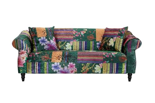 Lovesofas Green Multicoloured Patchwork Sofa – Fabric 3 Seater Couch with Striped & Floral Panels, Solid Wood Frame, Living Room & Conservatory Sofa