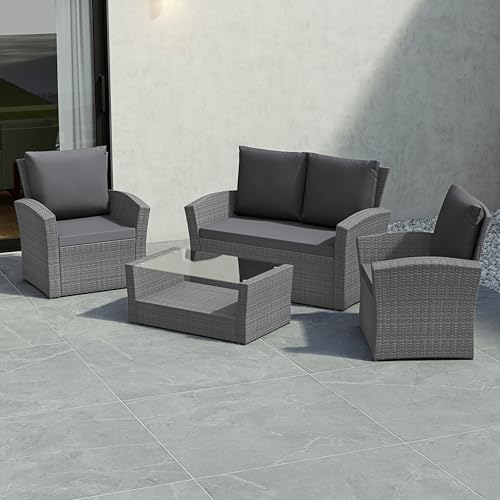 XEO HOME 4 Pc Rattan Garden Furniture Sets 4 Piece Indoor Outdoor Table and Chairs Set Balcony Patio and Conservatory Furniture Sofa Backyard Pool Side Coffee Seater (Grey)