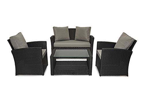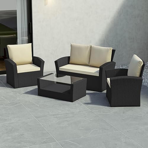 EVRE 4 Seater Rattan Garden Conservatory Patio Furniture Sofa Armchair Roma Set with Glass Top Coffee Table Wicker Weave Sofa and Cushions (Black)