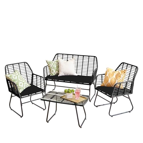4 Pc Rattan Garden Furniture Sets 4 Piece Indoor Outdoor Table and Chairs Set Balcony Patio and Conservatory Furniture Sofa Backyard Pool Side Coffee Seater (Black)