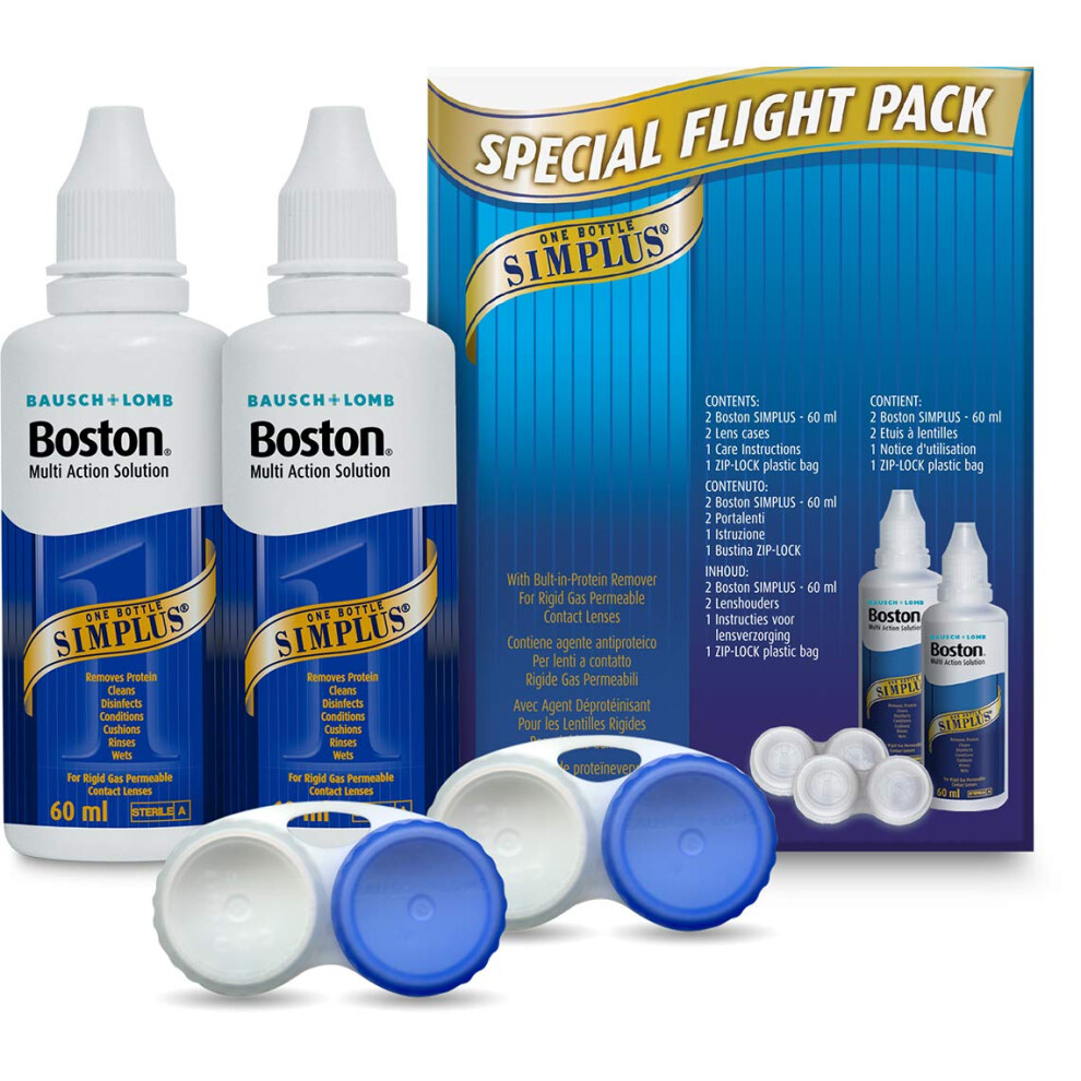Boston Simplus Travel Contact Lens Solution, 2X 60ml Flight Pack Size, Multi-Action Solution for Rigid Gas Permeable Contact Lenses, Clean, Disinfect & Condition, 2X Lens Cases for Travel Convenience