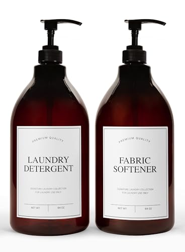 Calindiana Modern Farmhouse Liquid Laundry Detergent and Fabric Softener Dispenser for Laundry Room Decor and Organization, PET Plastic Landry Soap Containers with Water Resistant Labels, Amber 64oz