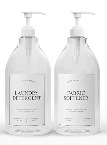 Calindiana Modern Farmhouse Liquid Laundry Detergent and Fabric Softener Dispenser for Laundry Room Decor and Organization, PET Plastic Landry Soap Containers with Water Resistant Labels, Clear 64oz