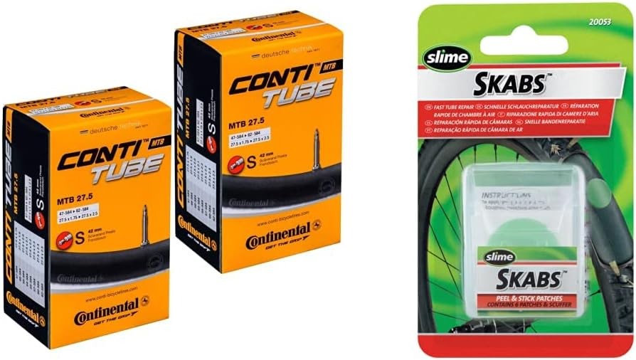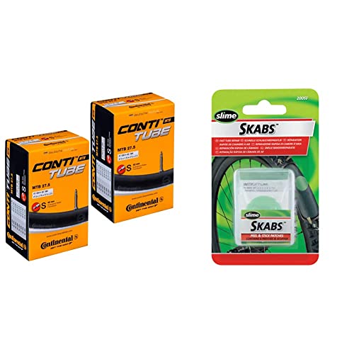 Continental MTB 27.5" x 1.75-2.5 Mountain Bike Inner Tubes with Presta Valve (Pair) & Slime 20053 Bike Skabs Patch Kit, for bike tube puncture repair, contains 6 patches and a metal scuffer