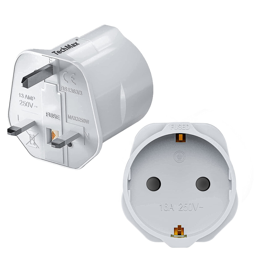TechMax European to UK Plug Adaptor Pack of 2 - Schuko 2 Pin Plug Adaptor to 3 Pin 13amp Fused 250v Grounded Travel Adapter Continental Type C E F To