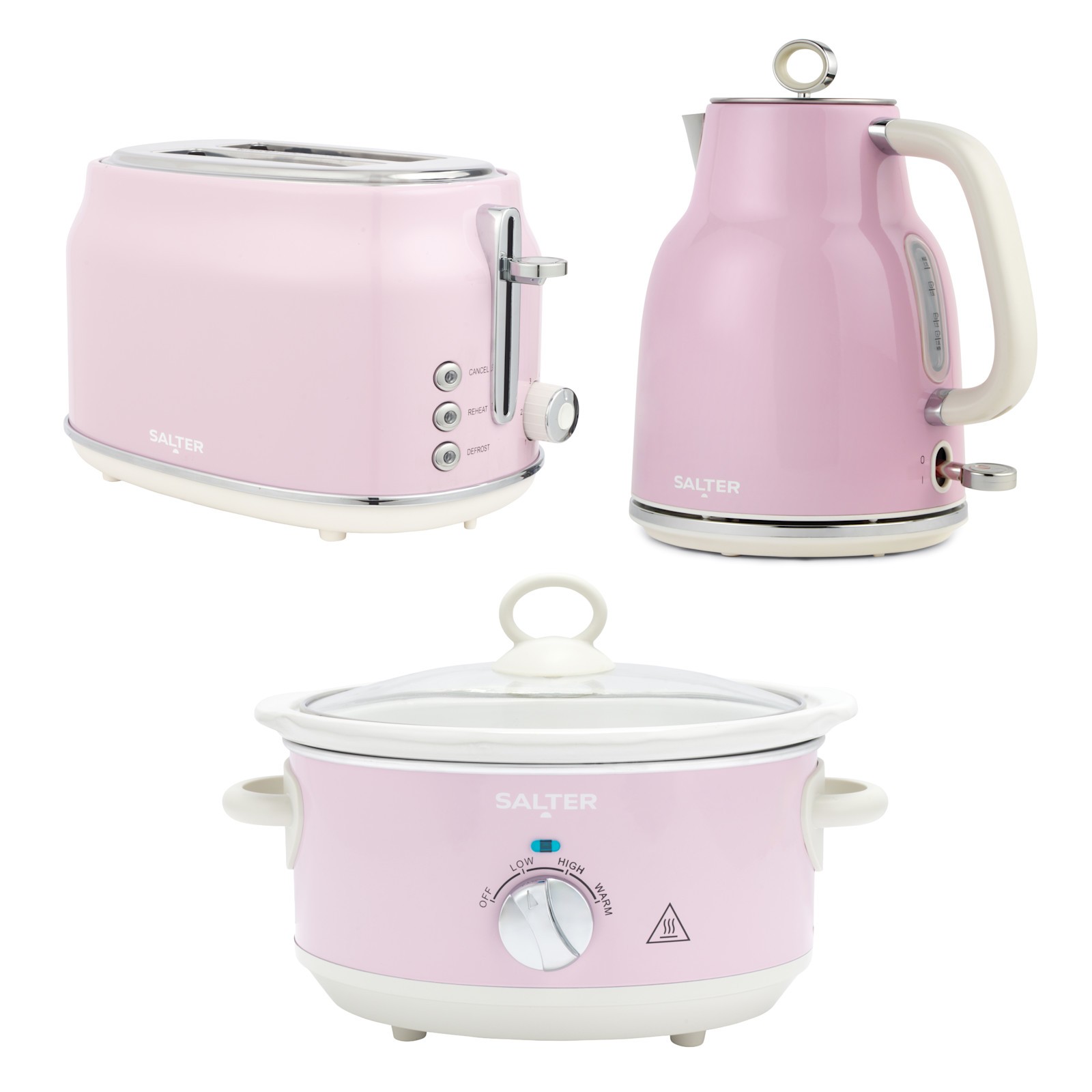 Salter Retro 1.7L Kettle, 4 Slice Toaster & 3.5L Electric Slow Cooker Set Pink