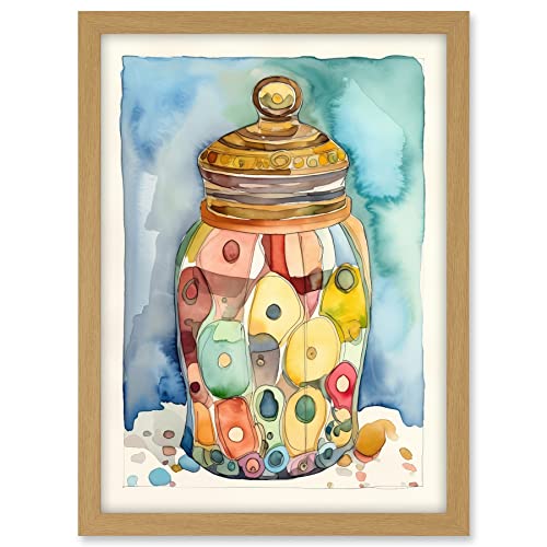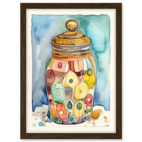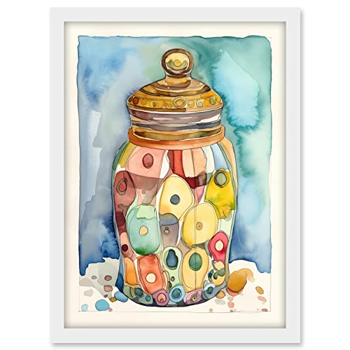 Artery8 Glass Cookie Jar With Sweets Folk Art Watercolour Painting Artwork Framed A3 Wall Art Print