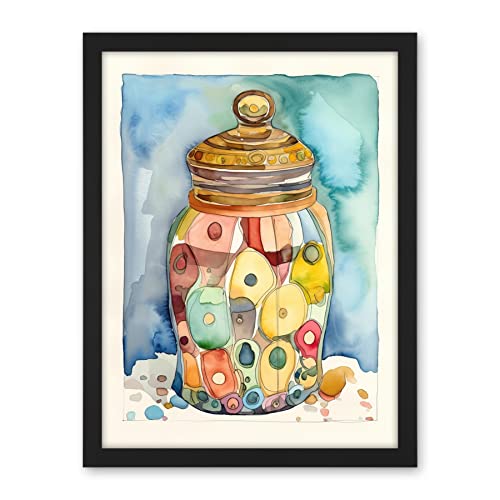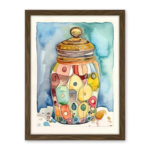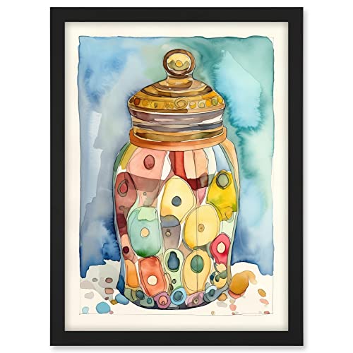 Artery8 Glass Cookie Jar With Sweets Folk Art Watercolour Painting Artwork Framed Wall Art Print 18X24 Inch