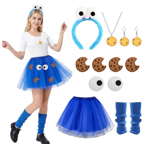 HarnyLoom Cookie Costume for Women Monster Costume Tutu Skirts Blue Monsters Headband Necklace Earrings, Carnival Book Character Costumes Accessories for World Book Day Halloween Masquerade