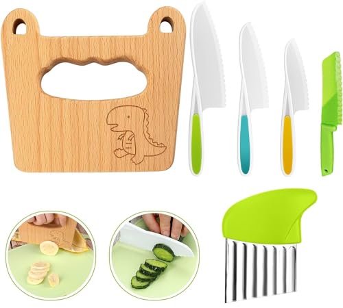 Kids Knife Set - Toddlers Safe Knife Set Kitchen Tools for Real Cooking - Montessori Wood Knives Sets with Y-Peeler Cutting Board Fruit Vegetable Crinkle Cutters Shapes