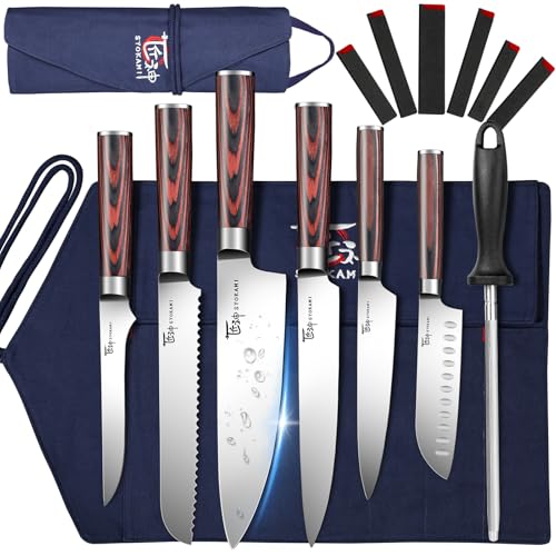SYOKAMI Knife Set, 9 Piece Japanese Kitchen Chef Knife Sets with Roll Bag, Professional Wooden Handle, High Carbon Steel Kitchen Knives with Case for Cooking Camp Outdoor Travel