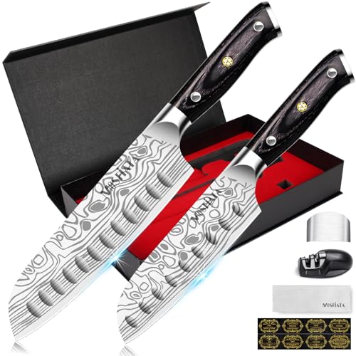 MOSFiATA Santoku Kitchen Knife Set, 2pcs Sharp Chef Knives Sets High Carbon German EN1.4116 Stainless Steel, 5.5"&7" Chopping Cooking Knife Kitchen Knives with Sharpener, Finger Guard Gift Box