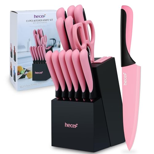 hecef Kitchen Knife Set with Block, Built-in Sharpening & Non-Sticking Coating - High Carbon Stainless Steel for Effortless Cooking! (Pink)