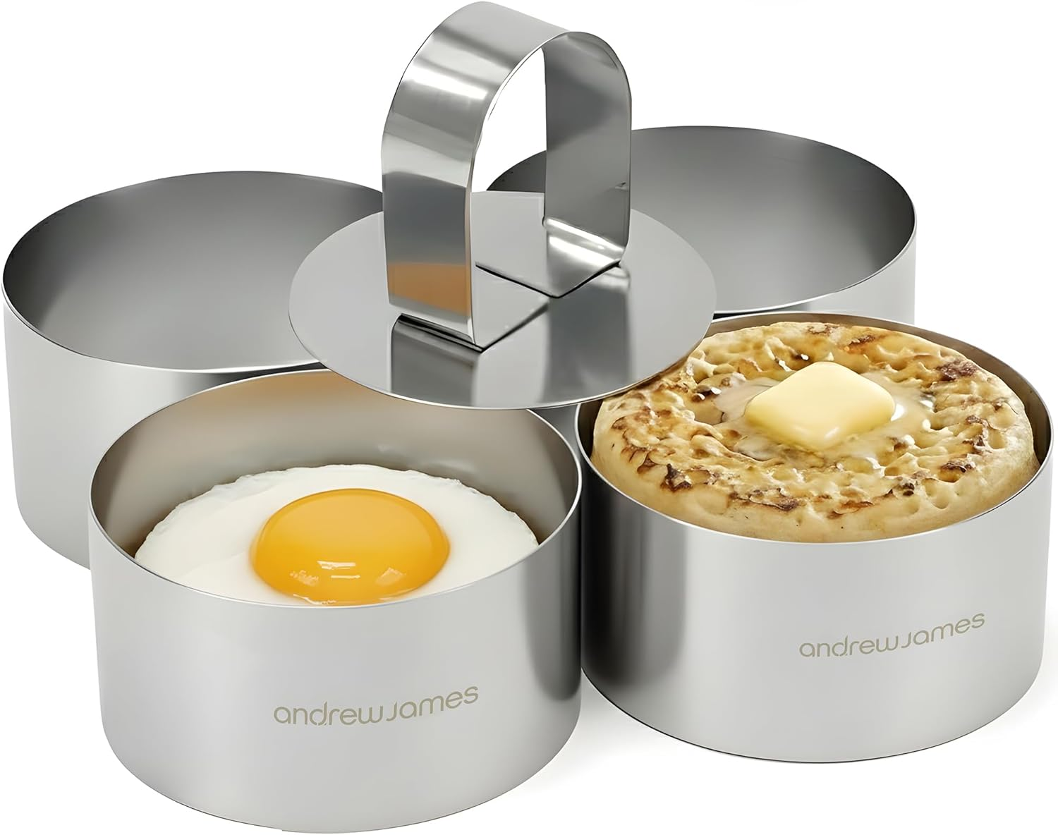 Andrew James Cooking Rings | Set of 4 Stainless Steel Cake Rings for Moulding & Presentation | Egg Rings Set Includes Food Press | Food Moulds for Freezer, Oven & Dishwasher Safe (4cm x 9cm)
