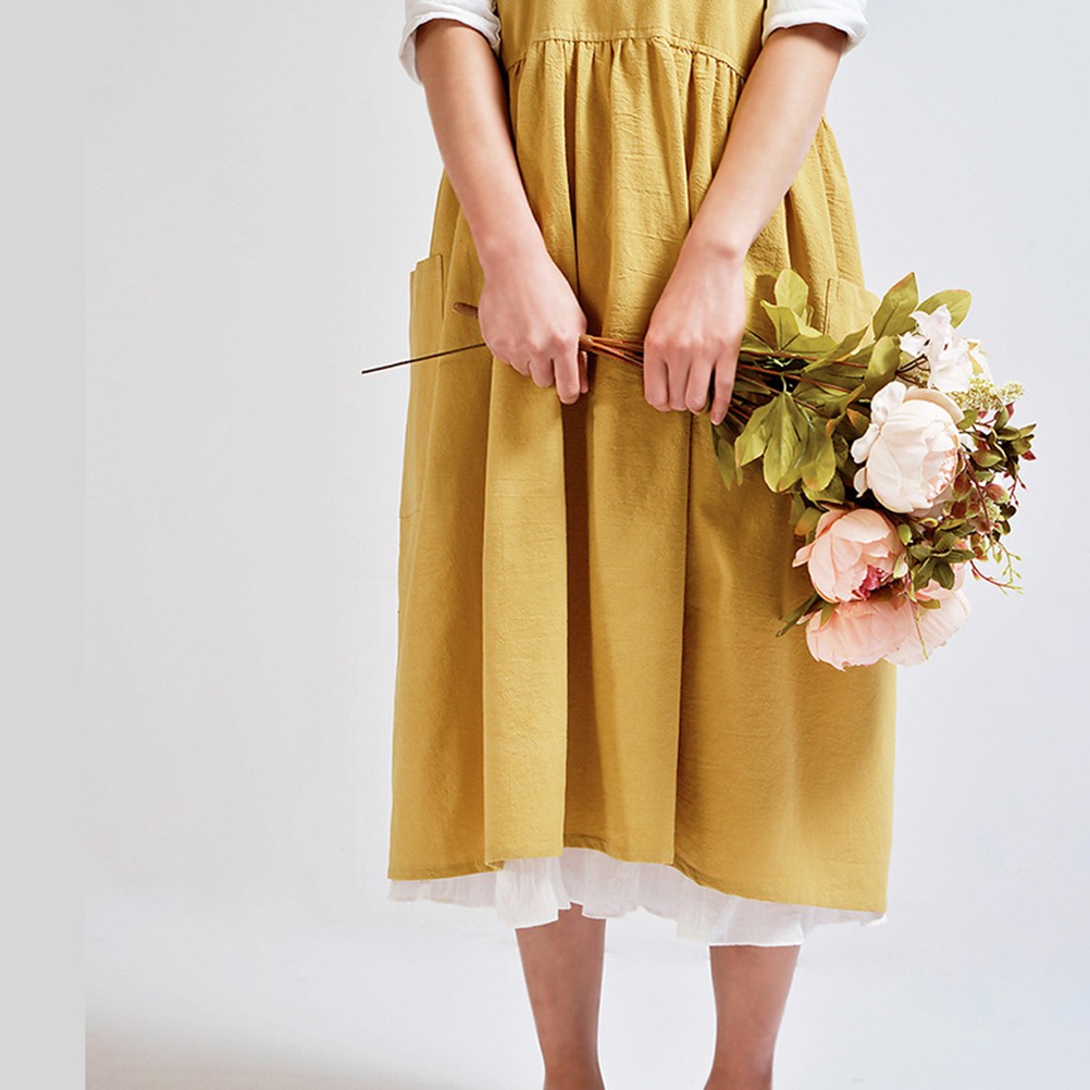 Women Kitchen Cooking Apron With 2 Front Pockets Cotton Linen Apron Coffee Shop-