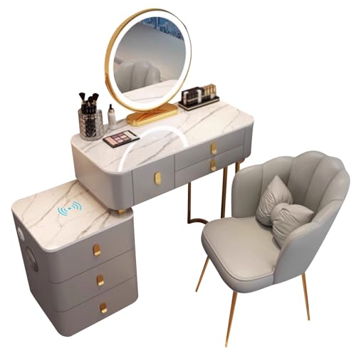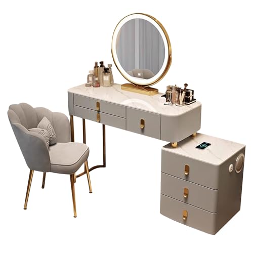 Preferspace Vanity with Chair Desk Adjustable LED Light Mirror Natural Warm Cool Modes Makeup Table Bluetooth Speakers Wireless Charging Storage Cabinet
