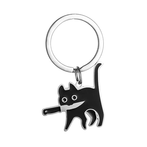 HLMYER Cute Black Cat Keyring Portable,Small Funny Cat Keyrings,Unisex Titanium Steel Cat Keyring,Cool Simple Cat Keychain,Cat with a Knife in its Mouth Keyring,for Friends Lovers Relative