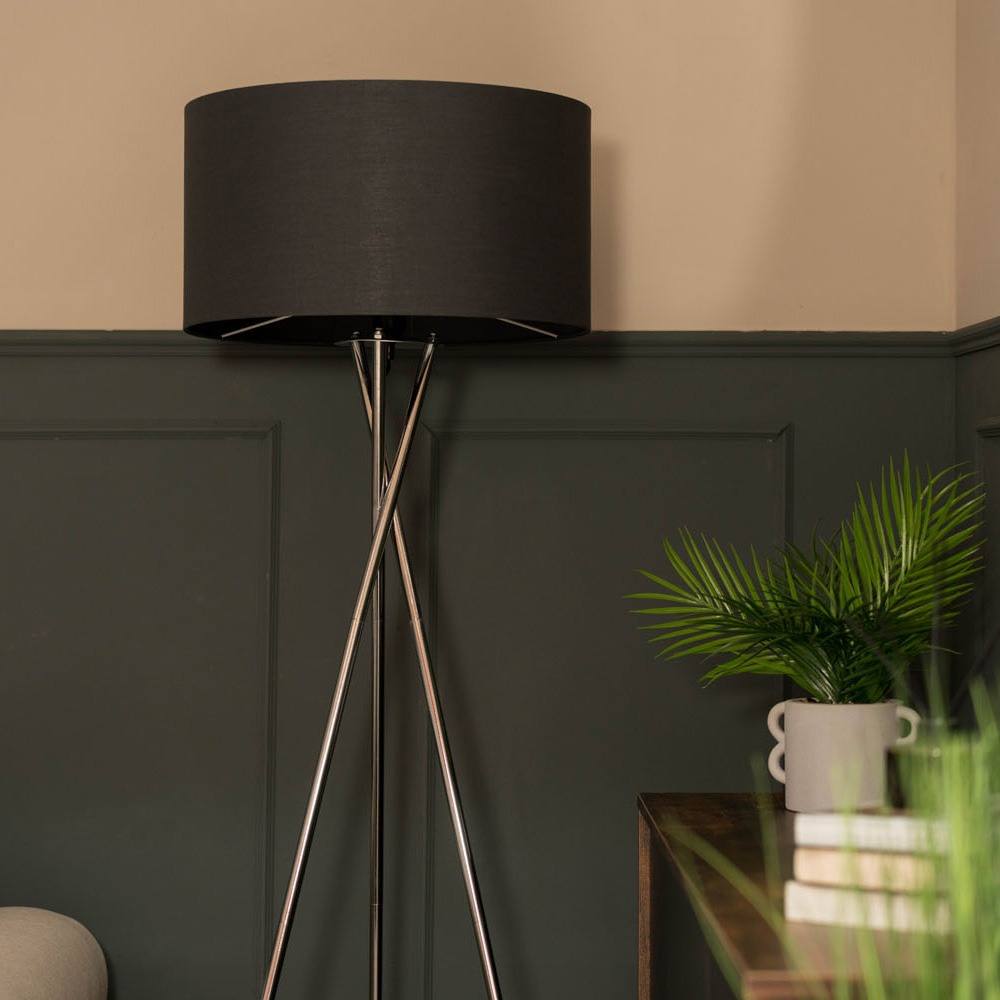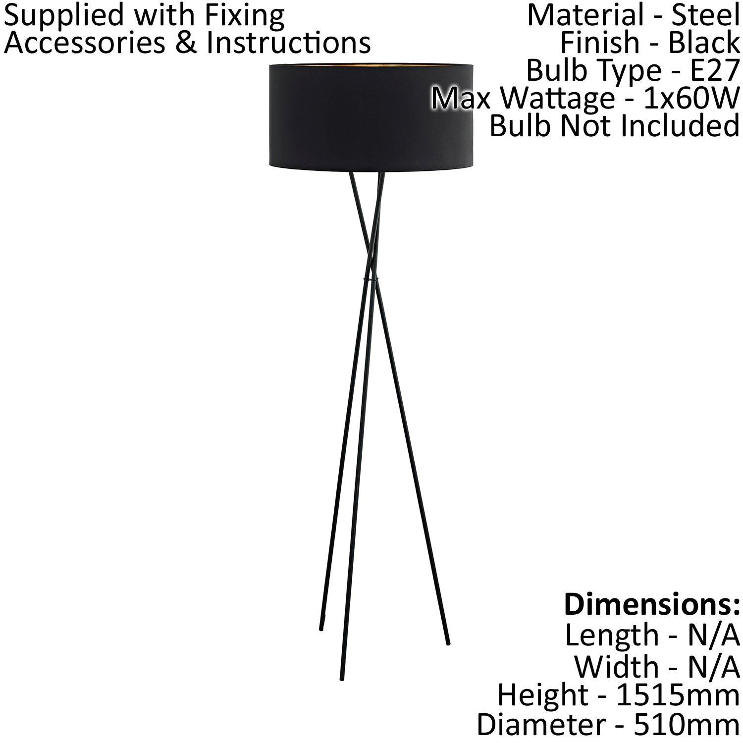 ValueLights Camden Copper Metal Tripod Floor Lamp with Drum Lamp Shade and Bulb in Black