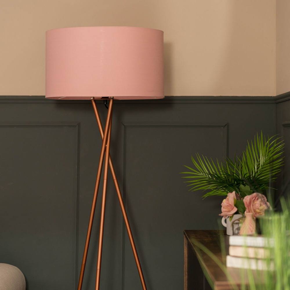 ValueLights Camden Copper Metal Tripod Floor Lamp with Blush Pink Drum Lamp Shade in Dusty Pink
