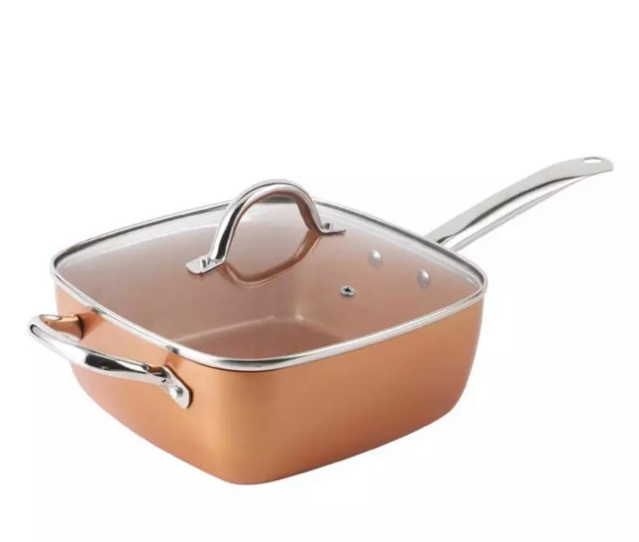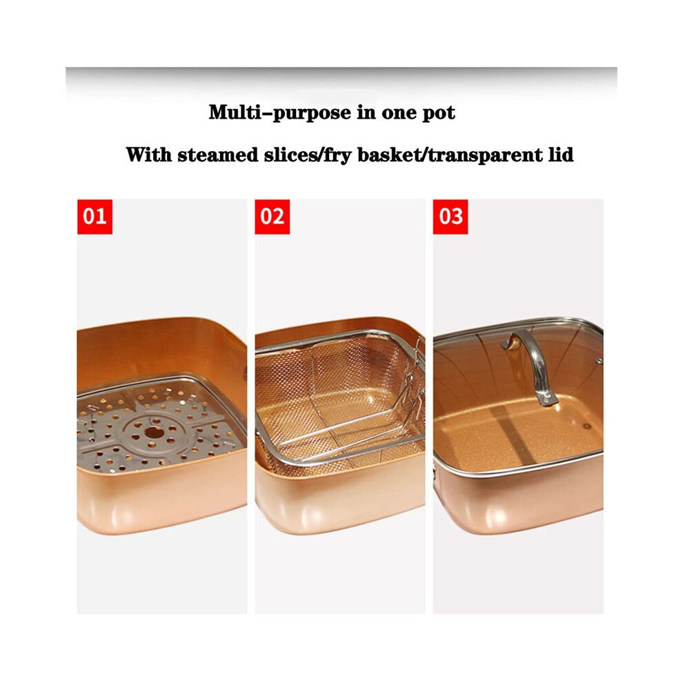 Cera Titanware 4pc Copper Non-Stick Deep Sided Square Pan Kit - Deep Frying Basket, Steamer, Lid. Oven proof, Induction Base - Great for Deep & Shallow Frying, Stir Fry, Roasting, Baking & Casseroles