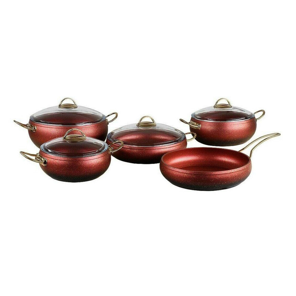 OMS Cookware Red Gold 9 Piece Non Stick Granite Copper Set Glass Lids Casserole Pan Pot - Essential, Pots and Pans Set