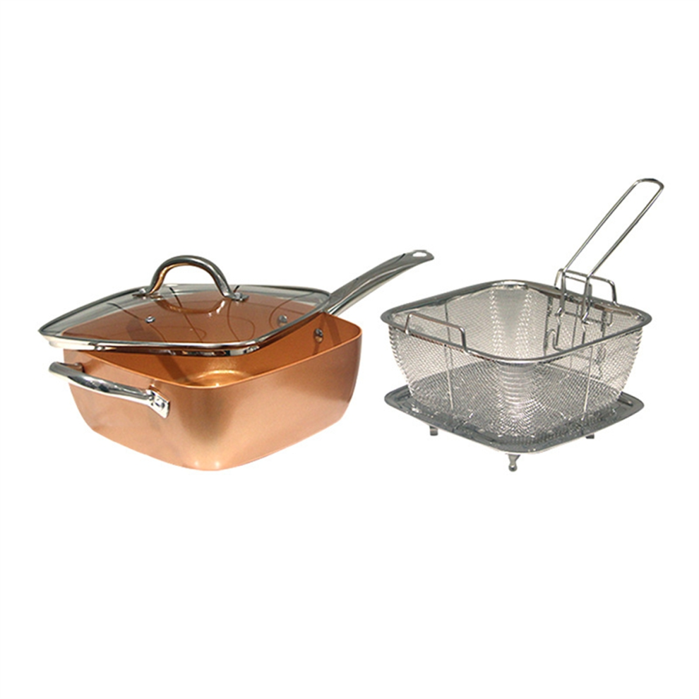 Copper Ceramic Deep Square Pan Set, Non-Stick Cooware Kit with Lid & Fry Basket