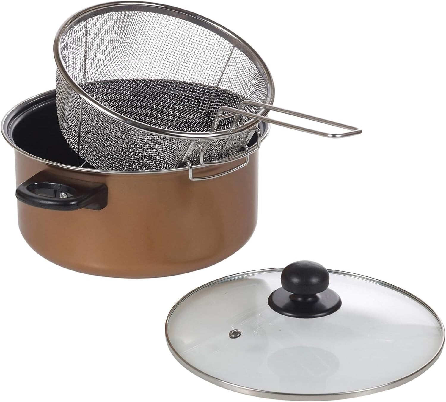 URBN-CHEF Stove Chip Deep Pan Fat Fryer Set Copper Look Frying Basket Glass Lid