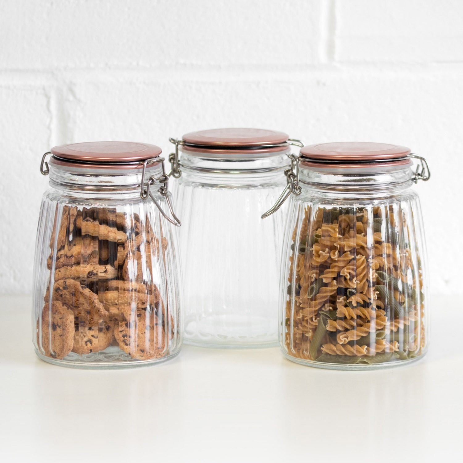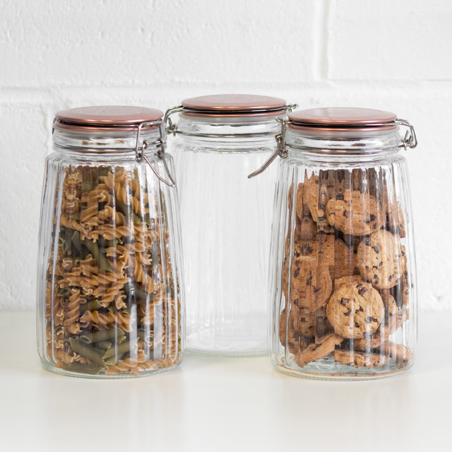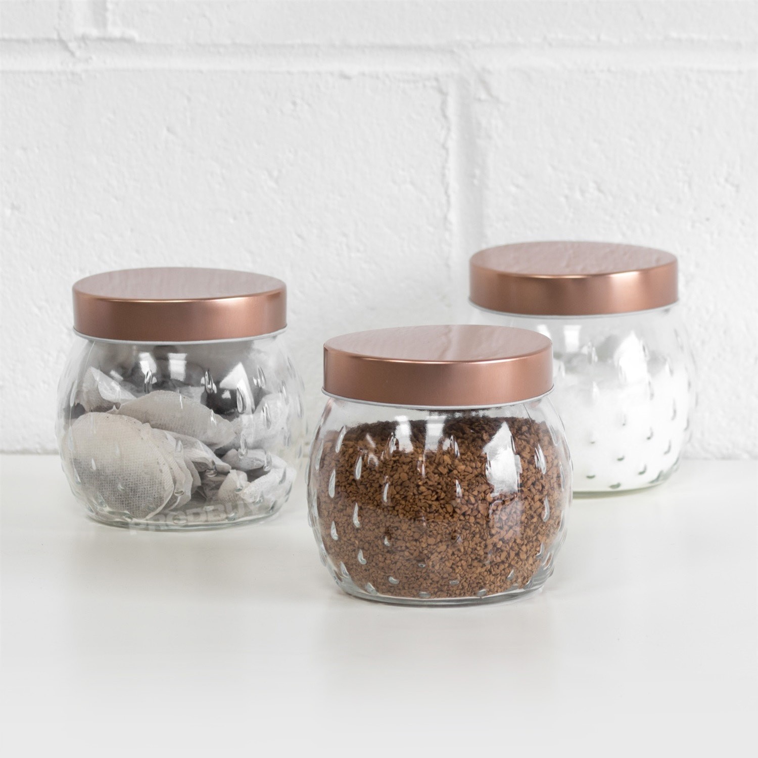 Set of 3 Glass Kitchen Storage Jars 1.2L Tea Coffee Sugar Canisters Copper Lids