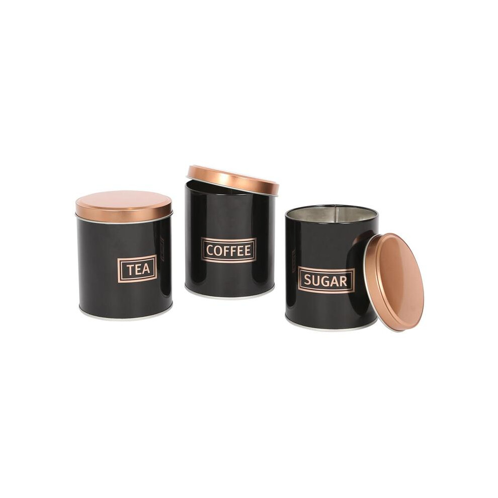 Cooks Professional 3 Piece Tea Coffee Sugar Cannister Set | Labelled Storage Tins | Containers with Airtight Lids | Canisters for Kitchen Accessories & Essentials | Black & Copper
