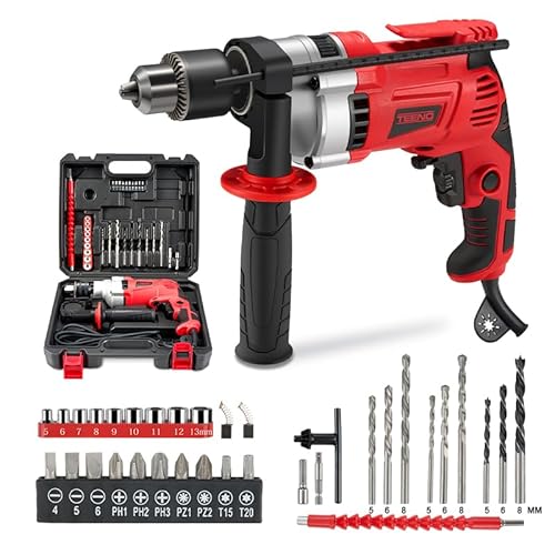 TEENO Electric Corded Hammer Drill 910W 38pcs Accessories with Carring Case, Hammer Drill 0-3000RPM, Variable Speed, 13mm Chuck, 360° Auxiliary Handle, for Concrete, Iron Plate, Masonry and Wood