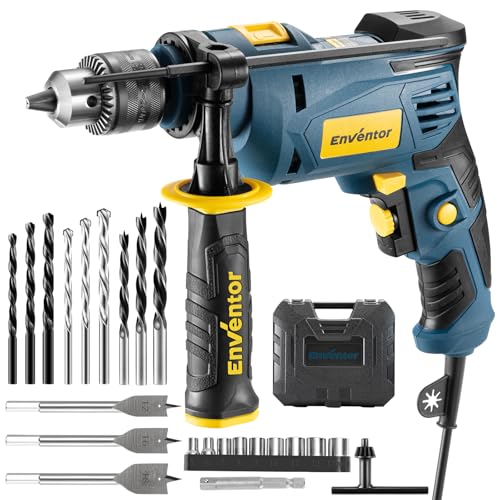Enventor Hammer Drill, 750W 0-3100RPM Electric Corded Hammer Drill, Variable Speed, 13mm Chuck, 360° Auxiliary Handle, with 24pcs Accessories for Concrete, Iron Plate, Masonry and Wood