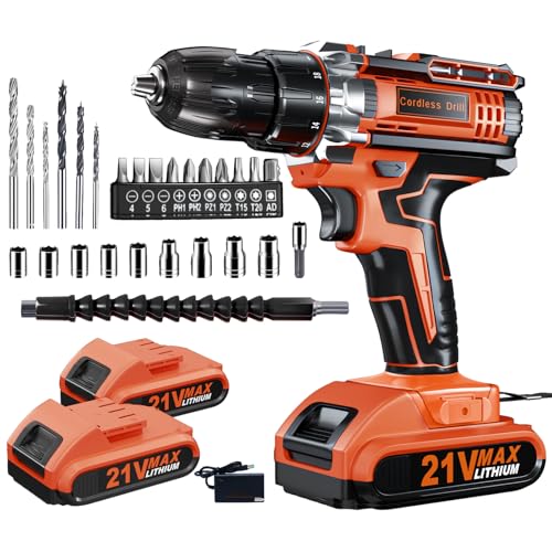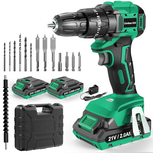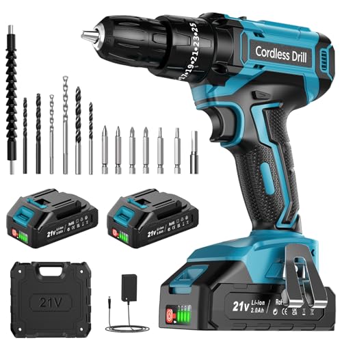 Cordless Drill Bit Set, 21V Power Drill Kit with 2 2.0AH Batteries, 21+1 Position, 3/8" Keyless Chuck, 29 Piece Drill Kit for DIY Projects