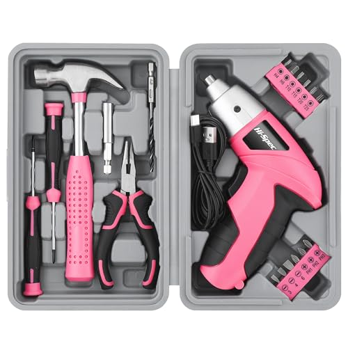Hi-Spec 35pc Pink Tool Kit with 3.6V USB Cordless Electric Screwdriver. Women’s DIY Home Repair & Maintenance Tool Set. Compact Toolbox with Hand Tools for Household Fixes & Assembly Tasks