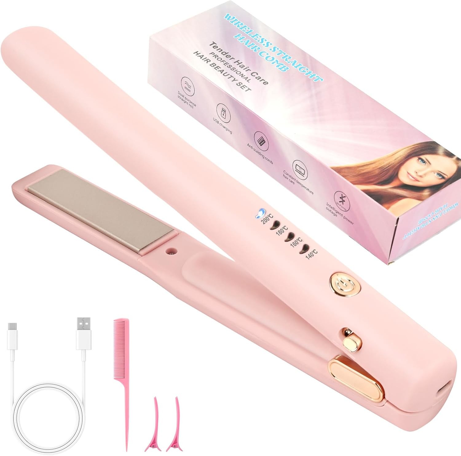 Cordless Hair Straightening Curler Portable Mini Hot Brush USB Rechargeable BAJ