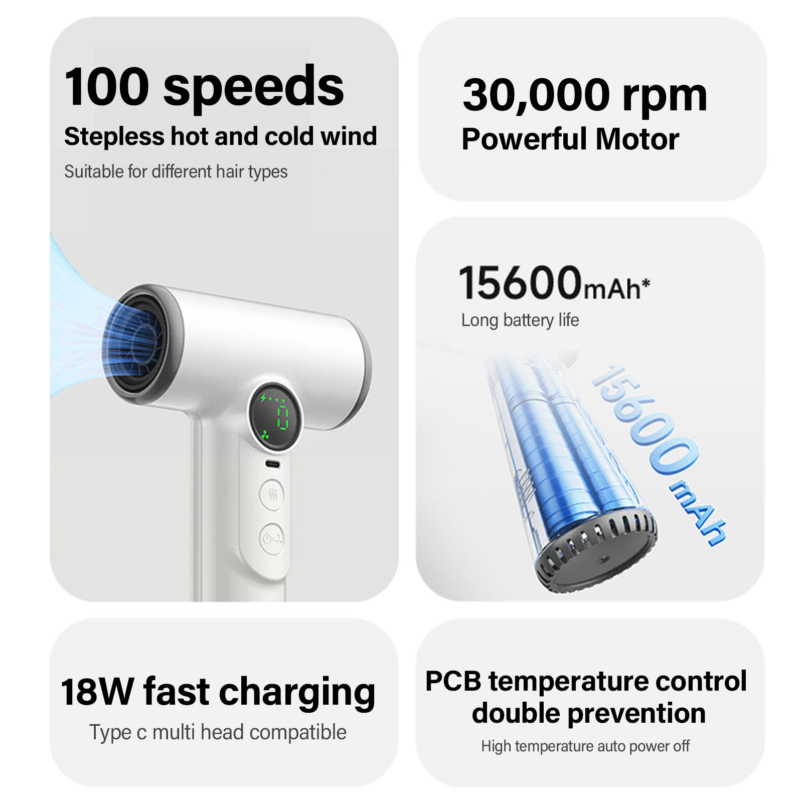 White Cordless Hair Dryer 100000RPM 15000mAh USB Rechargeable Powerful 200W TU