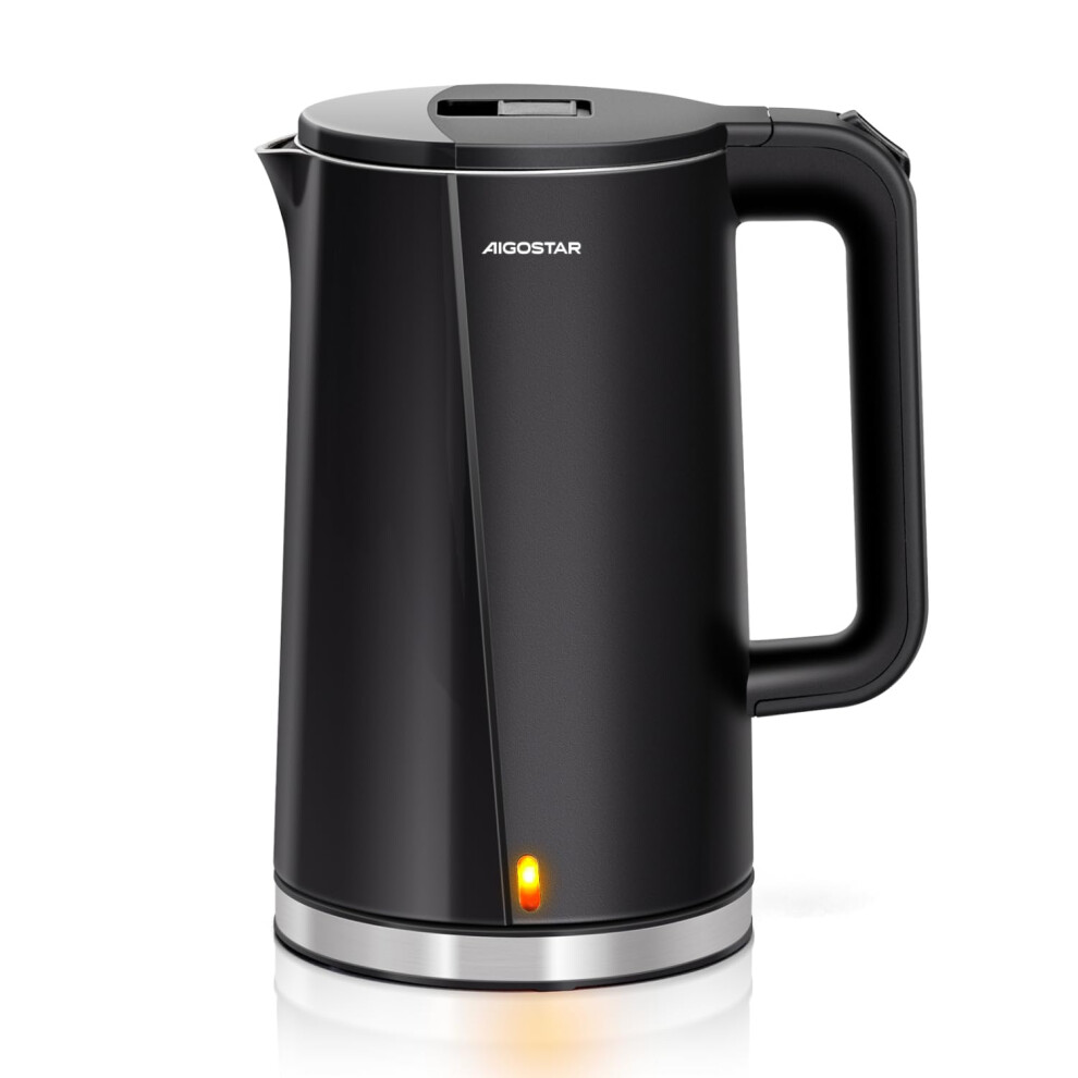 Aigostar Electric Kettle, Quiet Fast Boil Kettles Cordless, Double-Walled Anti-Scald Tea Kettle Black, Stainless Steel Interior, 2200W - Aubrey
