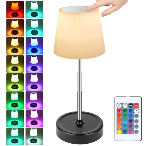 HOTUT Rechargeable Table Lamp, LED Touch Bedside Table Lamp, RGB 16 Colors Desk Lamp with Remote, Adjustable Height, Dimmable Night Light, Cordless Touch Lamps for Bedroom Living Room Bar Restaurant