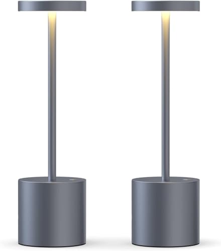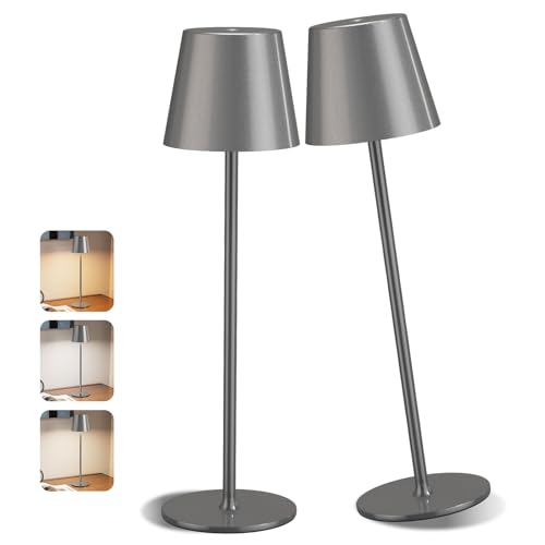 SLSMD Set of 2 Cordless Table Lamp IP54 Battery Operated Desk Lights 5000mAh Rechargeable Aluminum Metal Night Light 3 Color & Stepless Dimming Lamps Portable LED Lamps (2 Grey)