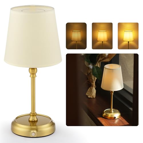 Amingulry Cordless Table Lamp, Rechargeable Battery Operated Lamp, 3 Color Modes & Stepless Dimmable LED Touch Lamp, Portable Retro Gold Metal Beside Lamps for Home Desk Bedroom Restaurant Outdoor
