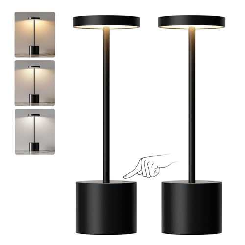 Cakkone Rechargeable Lamp with 3 Color Modes, Metal Cordless Lamps Touch Dimming, Wireless Lamp IP54 Waterproof, Rechargeable Table Lamp for Restaurant Bedroom Indoor Outdoor, Black